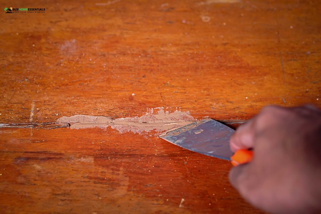 • Take a putty knife and scoop some wood filler onto it. Gently press the filler into the damaged areas, filling in the imperfections.